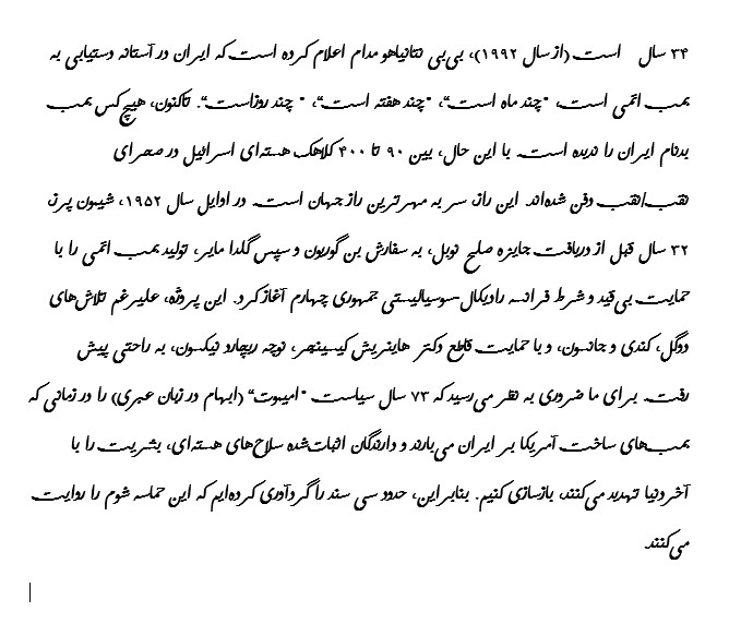 Bibi Netanyahou vocifère urbi et orbi depuis 33 ans (1992) que l’Iran est sur le point d’avoir une bombe atomique, « d’ici quelques mois », « d’ici quelques semaines », « d’ici quelques jours ». Pour le moment, personne n’a vu la fameuse bombe iranienne. En revanche, il y a, enterrées dans le désert du Néguev /Naqab, entre 90 et 400 ogives nucléaires israéliennes. C’est le secret de Polichinelle le mieux gardé au monde. Dès 1952, chargé de mission par Ben-Gourion puis Golda Meïr, Shimon Peres, 32 ans avant de recevoir le Prix Nobel de la Paix, a mis en place la fabrication de la bombe, avec l’appui inconditionnel de la France radical-socialiste de la IVème République et l’affaire a suivi un long cours tranquille, en dépit de de Gaulle, Kennedy, Johnson et avec un coup de pouce décisif du bon Docteur K., entendez Heinrich Kissinger, l’âme damnée de Tricky Dicky, alias Richard Nixon Il nous a semblé salutaire de reconstituer les 73 ans de politique d’“Amimut” (ambigüité, opacité en hébreu) au moment où les bombes made in USA pleuvent sur l’Iran et où les détenteurs avérés de bombes nucléaire menacent l’humanité d’un Armageddon. Nous avons donc assemblé une trentaine de documents qui retracent ce sinistre feuilleton. Lisez et indignez-vous !